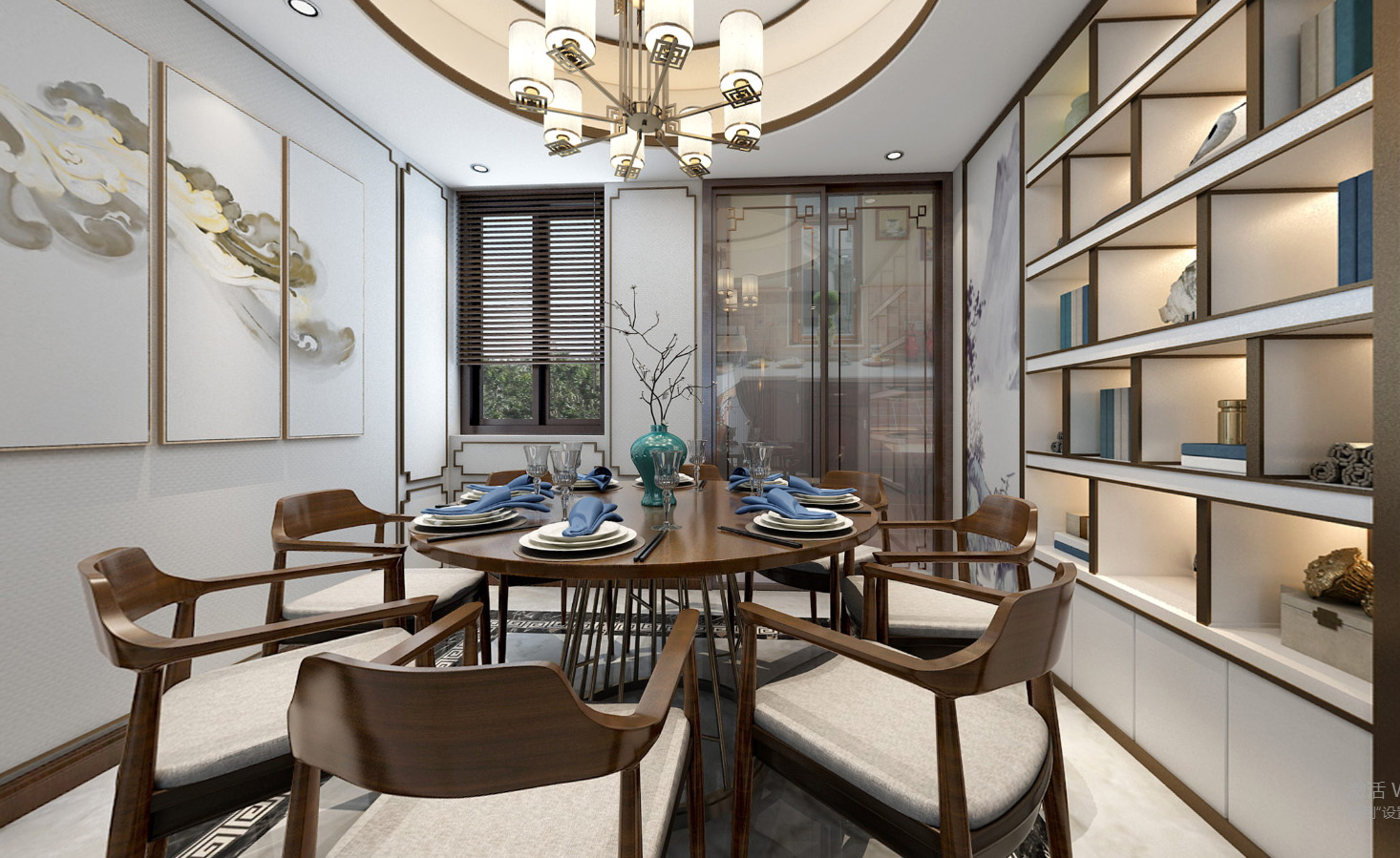 簡約的空間形制,給予人一種回歸自然、俯仰自得的圓融自在感,傳統(tǒng)而溫馨的圓桌,中式青瓷搭配肆意生長的枝椏,別有一番鮮麗動人的意韻,居住的詩意成了狹小空間里的一小片風景。