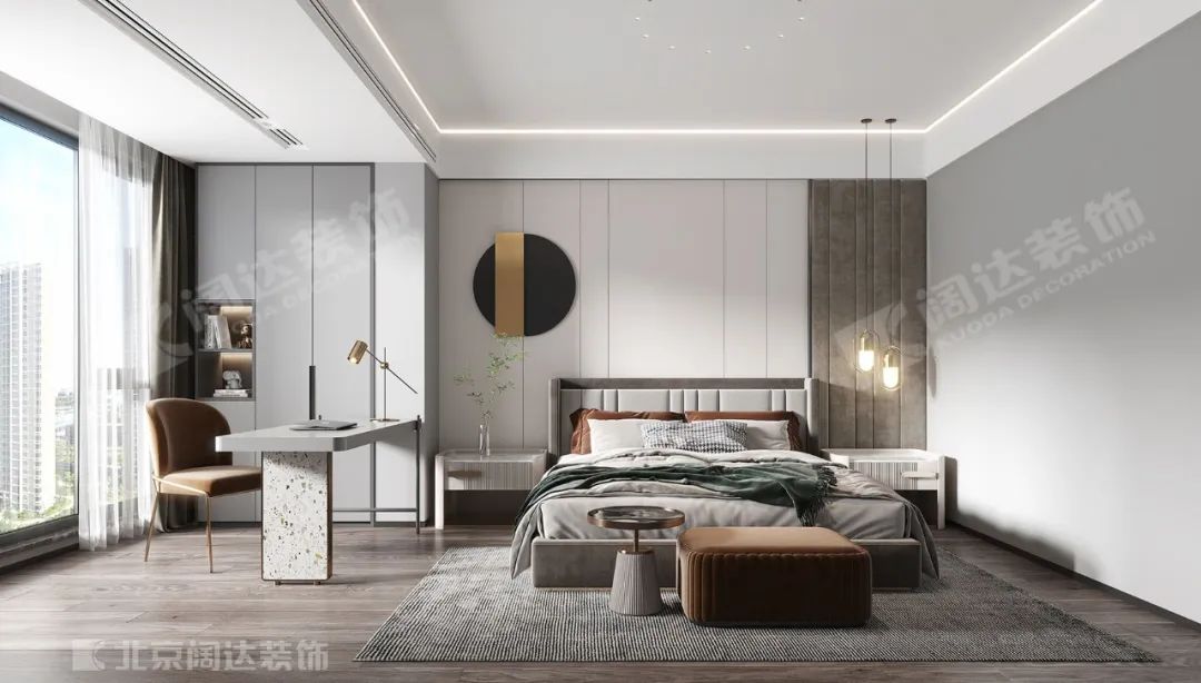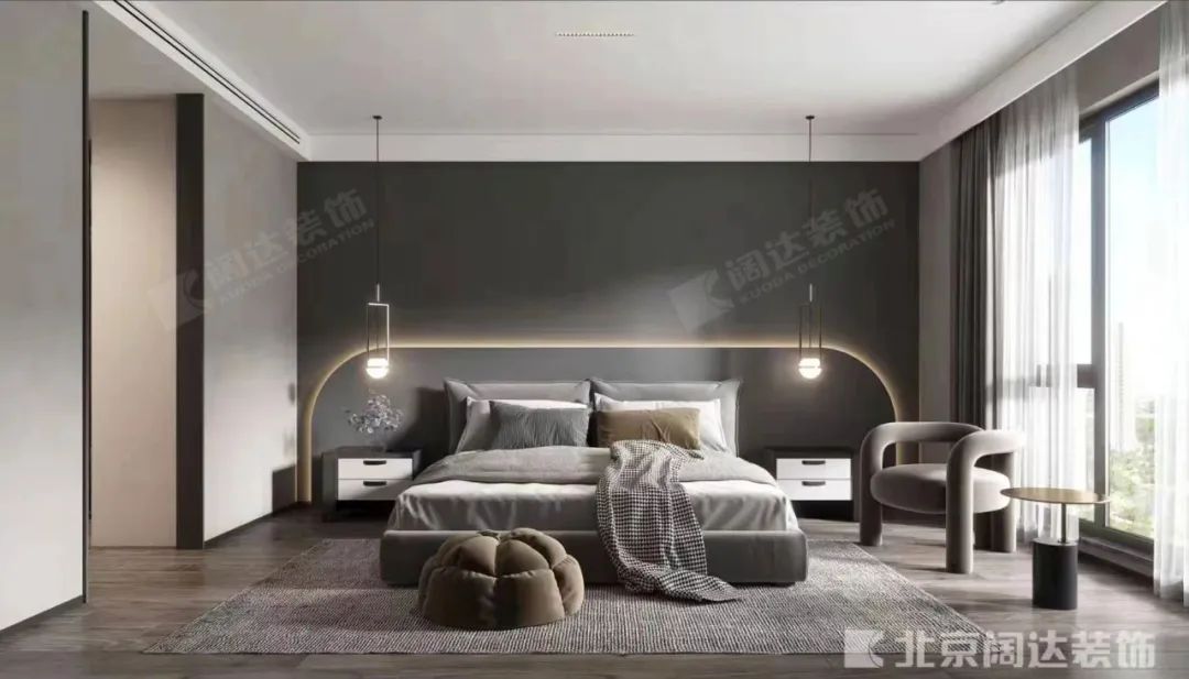 主臥空間的處理趨于簡(jiǎn)潔。床頭背景采用了灰色混油面板,使用了柔和的線條燈,除了美感之外,渲染出親切的生活底色。
