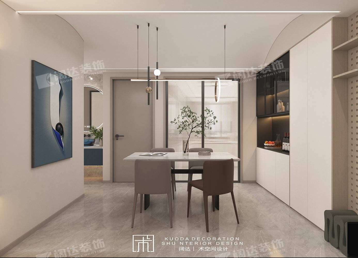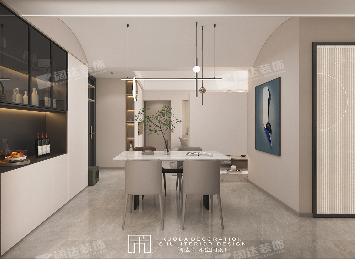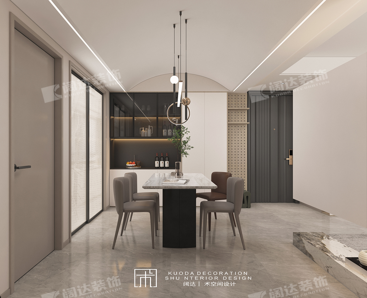 綜合以上調(diào)整結(jié)合業(yè)主需求,設(shè)計(jì)師又將陽(yáng)臺(tái)墻體拆除換成移門,整體基調(diào)簡(jiǎn)約為主,餐廳采用弧形頂設(shè)計(jì),輔以線性燈照明,既適當(dāng)放大層高,又烘托了就餐氛圍。