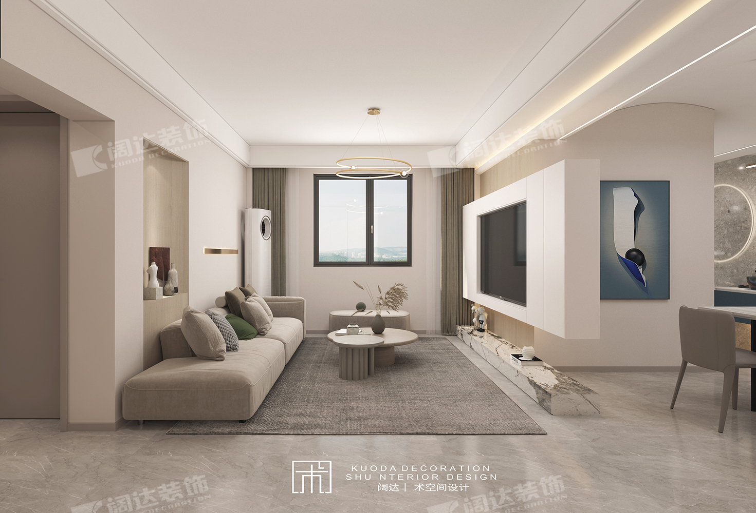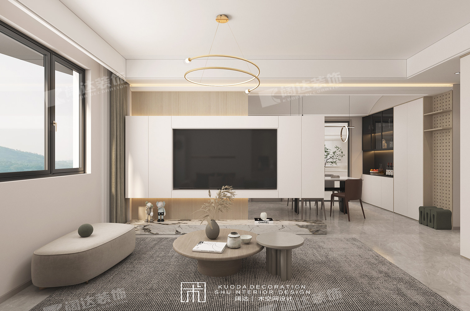 通過(guò)改變臥室門方向,延長(zhǎng)了客廳墻面,正好將沙發(fā)由南朝北放置于此,對(duì)面電視背景做懸空處理,將光線引入餐廳,整個(gè)區(qū)域采光、動(dòng)線和比例較為適宜。